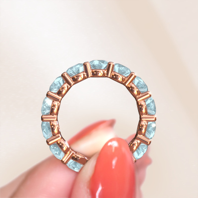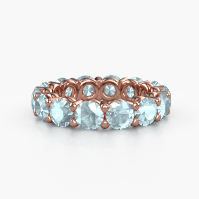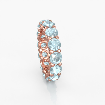 This is our Heddy rnd 4.7 ring. This specific type is called an eternity ring and it is set with a continuous line of identically cut gemstones. The ring is made in 14 Carat rose gold and is set with small aquamarine, 4.7 mm. This rose gold Eternity ring is a perfectly beautiful and meaningful way to give your proposal that special touch. The magnificent evenly shaped aquamarine are pave set around the ring. The identical aquamarine are carefully selected to give the ring a maximum effect. Do keep in mind we use natural resources so small differences between stones are common. The special effect is enhanced due to precise positioning of the aquamarine. This requires the utmost precision and a skilful hand but for our skilled artisans this is what excites them. The result is a ring with a row of aquamarine which seem to have no beginning nor end. The perfect symbol of your love for her! Isn't she a beauty?Because we design and deliver our own rings, we can offer you a ring at a price you won't find anywhere else. A ring is made to order, which helps prevent excess supplies, so we can make you a great price offer. We understand it feels risky, buying your ring online, but we will gladly assist in the designing process, taking your budget into consideration.Our team of talented, passionate designers add new ring designs to our online collection daily. Our objective in doing so, is to be able to offer you a wide variety of jewels. Please feel free to request a quote if you have specific wishes for your ring. We guarantee to make you an offer you can't refuse.To make it easier for you, we offer a 30 day return policy. Check our terms and conditions.