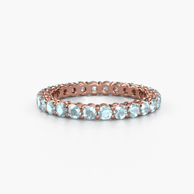 This is our Michelle full 2.4 ring. This specific type is called an eternity ring and it is set with a continuous line of identically cut gemstones. The ring is made in 14 Carat rose gold and is set with small aquamarine, 2.4 mm. This rose gold Eternity ring is a perfectly beautiful and meaningful way to give your proposal that special touch. The magnificent evenly shaped aquamarine are pave set around the ring. The identical aquamarine are carefully selected to give the ring a maximum effect. Do keep in mind we use natural resources so small differences between stones are common. The special effect is enhanced due to precise positioning of the aquamarine. This requires the utmost precision and a skilful hand but for our skilled artisans this is what excites them. The result is a stackable ring with a row of aquamarine which seem to have no beginning nor end. The perfect symbol of your love for her! Isn't she a beauty?After receiving your order, our goldsmiths will start the creative process of making your Michelle full 2.4 ring. We don't keep stock. This is advantageous because these costs will not be passed on to you. Therefore, we can offer jewellery at exceptionally low prices.