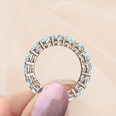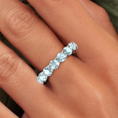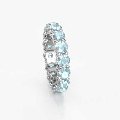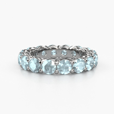 This is our Michelle full 4.2 ring. This specific type is called an eternity ring and it is set with a continuous line of identically cut gemstones. The ring is made in 14 Carat white gold and is set with small aquamarine, 4.2 mm. This white gold Eternity ring is a perfectly beautiful and meaningful way to give your proposal that special touch. The magnificent evenly shaped aquamarine are pave set around the ring. The identical aquamarine are carefully selected to give the ring a maximum effect. Do keep in mind we use natural resources so small differences between stones are common. The special effect is enhanced due to precise positioning of the aquamarine. This requires the utmost precision and a skilful hand but for our skilled artisans this is what excites them. The result is a stackable ring with a row of aquamarine which seem to have no beginning nor end. The perfect symbol of your love for her! Isn't she a beauty?After receiving your order, our goldsmiths will start the creative process of making your Michelle full 4.2 ring. We don't keep stock. This is advantageous because these costs will not be passed on to you. Therefore, we can offer jewellery at exceptionally low prices.New jewellery designs are added to our online collection daily. Our team of passionate designers strive to create extraordinary and diverse designs. Have you seen a ring you like? Please feel free to contact us. Based on a good price/ quality ratio, we will make you an offer you can't refuse!To make it easier for you, we offer a 30 day return policy. Check our terms and conditions.