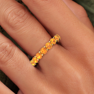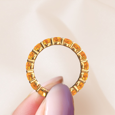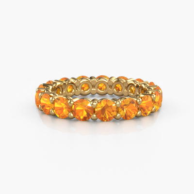 This is our Heddy rnd 3.7 ring. This specific type is called an eternity ring and it is set with a continuous line of identically cut gemstones. The ring is made in 14 Carat gold and is set with small citrin, 3.7 mm. This gold Eternity ring is a perfectly beautiful and meaningful way to give your proposal that special touch. The magnificent evenly shaped citrin are pave set around the ring. The identical citrin are carefully selected to give the ring a maximum effect. Do keep in mind we use natural resources so small differences between stones are common. The special effect is enhanced due to precise positioning of the citrin. This requires the utmost precision and a skilful hand but for our skilled artisans this is what excites them. The result is a stackable ring with a row of citrin which seem to have no beginning nor end. The perfect symbol of your love for her! Isn't she a beauty?By using our modern techniques, we can design and customize the finest quality jewels with the utmost care for you. Our rings are always priced 30 percent lower than other jewellers. We make rings to order, so we don't have to maintain a large stock. If you have a certain budget, we are more than happy to advice you accordingly.New jewellery designs are added to our online collection daily. Our team of passionate designers strive to create extraordinary and diverse designs. Have you seen a ring you like? Please feel free to contact us. Based on a good price/ quality ratio, we will make you an offer you can't refuse!To make it easier for you, we offer a 30 day return policy. Check our terms and conditions.