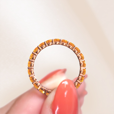 This is our Heddy rnd 2.7 ring. This specific type is called an eternity ring and it is set with a continuous line of identically cut gemstones. The ring is made in 14 Carat rose gold and is set with small citrin, 2.7 mm. This rose gold Eternity ring is a perfectly beautiful and meaningful way to give your proposal that special touch. The magnificent evenly shaped citrin are pave set around the ring. The identical citrin are carefully selected to give the ring a maximum effect. Do keep in mind we use natural resources so small differences between stones are common. The special effect is enhanced due to precise positioning of the citrin. This requires the utmost precision and a skilful hand but for our skilled artisans this is what excites them. The result is a stackable ring with a row of citrin which seem to have no beginning nor end. The perfect symbol of your love for her! Isn't she a beauty?Because we design and deliver our own rings, we can offer you a ring at a price you won't find anywhere else. A ring is made to order, which helps prevent excess supplies, so we can make you a great price offer. We understand it feels risky, buying your ring online, but we will gladly assist in the designing process, taking your budget into consideration.Our team of talented, passionate designers add new ring designs to our online collection daily. Our objective in doing so, is to be able to offer you a wide variety of jewels. Please feel free to request a quote if you have specific wishes for your ring. We guarantee to make you an offer you can't refuse.To make it easier for you, we offer a 30 day return policy. Check our terms and conditions.