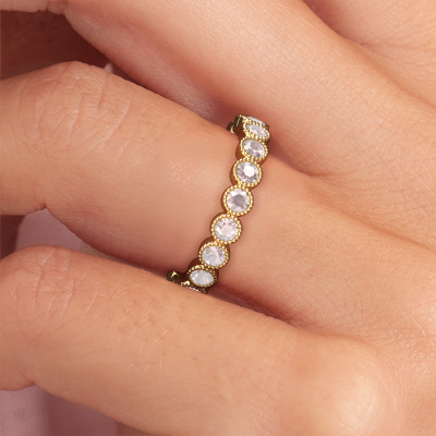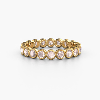 This is our Mariam 0.05 ring. This specific type is called an eternity ring and it is set with a continuous line of identically cut gemstones. The ring is made in 14 Carat gold and is set with small morganite champagne, 2.4 mm. The amazing morganite champagne are identical in size and are set in the ring band. Our morganite champagne are selected with great care so they are identical, which gives the best result. In order to get the best result, our artisans position all morganite champagne by hand with the utmost care. Our Goldsmiths have one ambition, which is creating the perfect ring. That is why we love what we do. In the end you get a stunning modern gold ring with a row of morganite champagne which seem to have no beginning nor end. The perfect symbol of your undying love for her! How special is that!