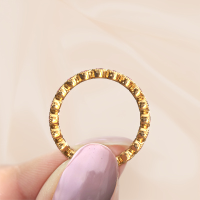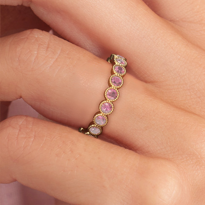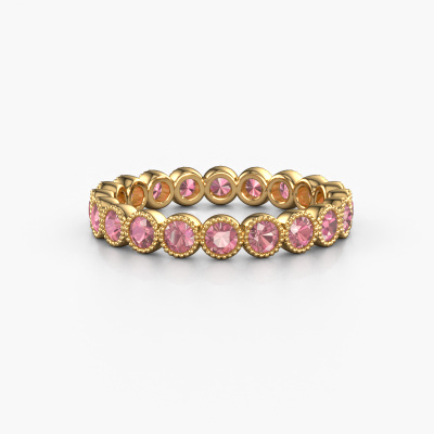 This is our Mariam 0.05 ring. This specific type is called an eternity ring and it is set with a continuous line of identically cut gemstones. The ring is made in 14 Carat gold and is set with small tourmaline pink, 2.4 mm. The amazing tourmaline pink are identical in size and are set in the ring band. Our tourmaline pink are selected with great care so they are identical, which gives the best result. In order to get the best result, our artisans position all tourmaline pink by hand with the utmost care. Our Goldsmiths have one ambition, which is creating the perfect ring. That is why we love what we do. In the end you get a stunning modern gold ring with a row of tourmaline pink which seem to have no beginning nor end. The perfect symbol of your undying love for her! How special is that!By using a combination of the latest modern techniques, combined with ancient crafting, we can make all our rings in our own studio. Each jewel is made to order. This is advantageous because we can offer you a price you won't find anywhere else.