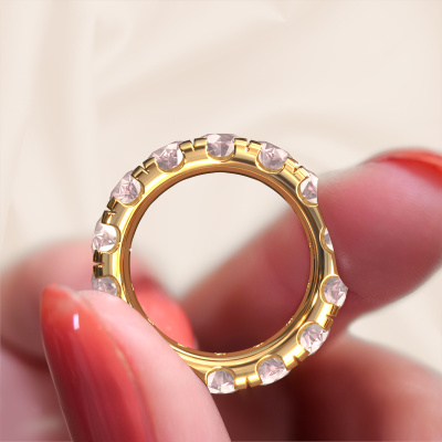 This is our Jackie 4.7 ring. This specific type is called an eternity ring and it is set with a continuous line of identically cut gemstones. The ring is made in 14 Carat gold and is set with small morganite champagne, 4.7 mm. The amazing morganite champagne are identical in size and are set in the ring band. Our morganite champagne are selected with great care so they are identical, which gives the best result. In order to get the best result, our artisans position all morganite champagne by hand with the utmost care. Our Goldsmiths have one ambition, which is creating the perfect ring. That is why we love what we do. In the end you get a stunning exclusive gold stackable ring with a row of morganite champagne which seem to have no beginning nor end. The perfect symbol of your undying love for her! How special is that!Because we design and deliver our own rings, we can offer you a ring at a price you won't find anywhere else. A ring is made to order, which helps prevent excess supplies, so we can make you a great price offer. We understand it feels risky, buying your ring online, but we will gladly assist in the designing process, taking your budget into consideration.Our team of talented, passionate designers add new ring designs to our online collection daily. Our objective in doing so, is to be able to offer you a wide variety of jewels. Please feel free to request a quote if you have specific wishes for your ring. We guarantee to make you an offer you can't refuse.To make it easier for you, we offer a 30 day return policy. Check our terms and conditions.