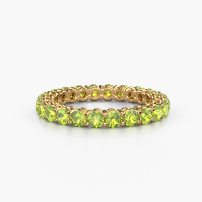 This is our Michelle full 2.7 ring. This specific type is called an eternity ring and it is set with a continuous line of identically cut gemstones. The ring is made in 14 Carat gold and is set with small peridot, 2.7 mm. The amazing peridot are identical in size and are set in the ring band. Our peridot are selected with great care so they are identical, which gives the best result. In order to get the best result, our artisans position all peridot by hand with the utmost care. Our Goldsmiths have one ambition, which is creating the perfect ring. That is why we love what we do. In the end you get a stunning classic gold stackable ring with a row of peridot which seem to have no beginning nor end. The perfect symbol of your undying love for her! How special is that!By using a combination of the latest modern techniques, combined with ancient crafting, we can make all our rings in our own studio. Each jewel is made to order. This is advantageous because we can offer you a price you won't find anywhere else.New jewellery designs are added to our online collection daily. Our team of passionate designers strive to create extraordinary and diverse designs. Have you seen a ring you like? Please feel free to contact us. Based on a good price/ quality ratio, we will make you an offer you can't refuse!To make it easier for you, we offer a 30 day return policy. Check our terms and conditions.
