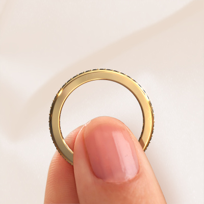 This is our Elvire 2 ring. This specific type is called an eternity ring and it is set with a continuous line of identically cut gemstones. The ring is made in 14 Carat gold and is set with small black diamonds, 0.414 crt. The amazing black diamonds are identical in size and are set in the ring band. Our black diamonds are selected with great care so they are identical, which gives the best result. In order to get the best result, our artisans position all black diamonds by hand with the utmost care. Our Goldsmiths have one ambition, which is creating the perfect ring. That is why we love what we do. In the end you get a stunning modern gold stackable ring with a row of black diamonds which seem to have no beginning nor end. The perfect symbol of your undying love for her! How special is that!Are you on a budget? Please feel free to contact us, so we can go discuss your options. We offer our rings at guaranteed best price, because we make them to order. You won't find such a price anywhere else!New jewellery designs are added to our online collection daily. Our team of passionate designers strive to create extraordinary and diverse designs. Have you seen a ring you like? Please feel free to contact us. Based on a good price/ quality ratio, we will make you an offer you can't refuse!To make it easier for you, we offer a 30 day return policy. Check our terms and conditions.