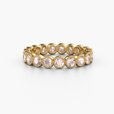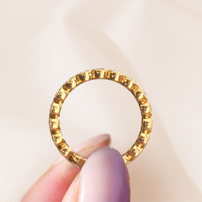 This is our Mariam 0.07 ring. This specific type is called an eternity ring and it is set with a continuous line of identically cut gemstones. The ring is made in 14 Carat gold and is set with small morganite champagne, 2.7 mm. The amazing morganite champagne are identical in size and are set in the ring band. Our morganite champagne are selected with great care so they are identical, which gives the best result. In order to get the best result, our artisans position all morganite champagne by hand with the utmost care. Our Goldsmiths have one ambition, which is creating the perfect ring. That is why we love what we do. In the end you get a stunning traditional gold ring with a row of morganite champagne which seem to have no beginning nor end. The perfect symbol of your undying love for her! How special is that!