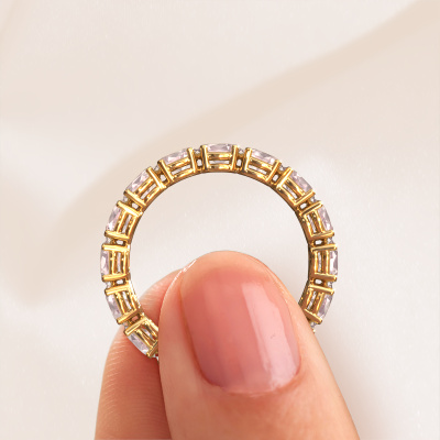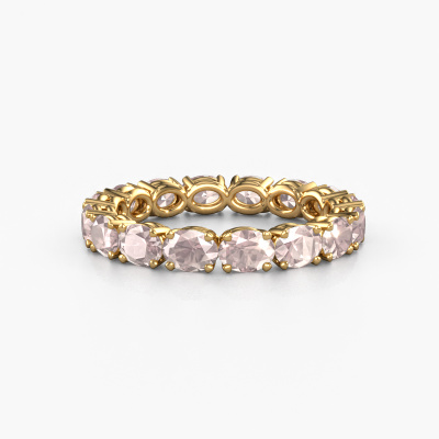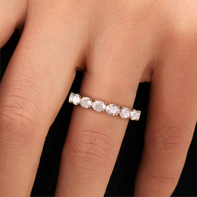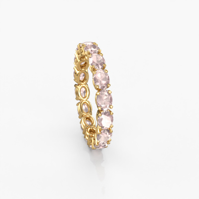 This is our Vivienne OVL 4x3 ring. This specific type is called an eternity ring and it is set with a continuous line of identically cut gemstones. The ring is made in 14 Carat gold and is set with small morganite champagne, 4x3 mm. This gold Eternity ring is a perfectly beautiful and meaningful way to give your proposal that special touch. The magnificent evenly shaped morganite champagne are pave set around the ring. The identical morganite champagne are carefully selected to give the ring a maximum effect. Do keep in mind we use natural resources so small differences between stones are common. The special effect is enhanced due to precise positioning of the morganite champagne. This requires the utmost precision and a skilful hand but for our skilled artisans this is what excites them. The result is a ring with a row of morganite champagne which seem to have no beginning nor end. The perfect symbol of your love for her! Isn't she a beauty?