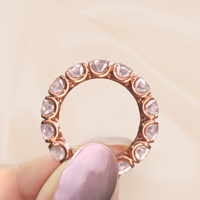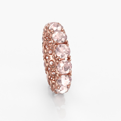 This is our Estee 4.7 ring. This specific type is called an eternity ring and it is set with a continuous line of identically cut gemstones. The ring is made in 14 Carat rose gold and is set with small morganite champagne, 4.7 mm. This rose gold Eternity ring is a perfectly beautiful and meaningful way to give your proposal that special touch. The magnificent evenly shaped morganite champagne are pave set around the ring. The identical morganite champagne are carefully selected to give the ring a maximum effect. Do keep in mind we use natural resources so small differences between stones are common. The special effect is enhanced due to precise positioning of the morganite champagne. This requires the utmost precision and a skilful hand but for our skilled artisans this is what excites them. The result is a ring with a row of morganite champagne which seem to have no beginning nor end. The perfect symbol of your love for her! Isn't she a beauty?By using our modern techniques, we can design and customize the finest quality jewels with the utmost care for you. Our rings are always priced 30 percent lower than other jewellers. We make rings to order, so we don't have to maintain a large stock. If you have a certain budget, we are more than happy to advice you accordingly.