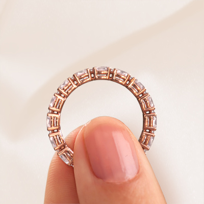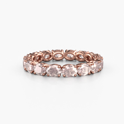 This is our Vivienne OVL 4x3 ring. This specific type is called an eternity ring and it is set with a continuous line of identically cut gemstones. The ring is made in 14 Carat rose gold and is set with small morganite champagne, 4x3 mm. This rose gold Eternity ring is a perfectly beautiful and meaningful way to give your proposal that special touch. The magnificent evenly shaped morganite champagne are pave set around the ring. The identical morganite champagne are carefully selected to give the ring a maximum effect. Do keep in mind we use natural resources so small differences between stones are common. The special effect is enhanced due to precise positioning of the morganite champagne. This requires the utmost precision and a skilful hand but for our skilled artisans this is what excites them. The result is a ring with a row of morganite champagne which seem to have no beginning nor end. The perfect symbol of your love for her! Isn't she a beauty?
