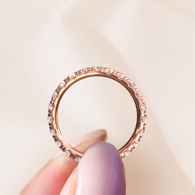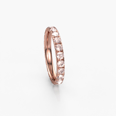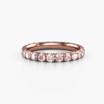 This is our Jackie 2.5 ring. This specific type is called an eternity ring and it is set with a continuous line of identically cut gemstones. The ring is made in 14 Carat rose gold and is set with small morganite champagne, 2.5 mm. This rose gold Eternity ring is a perfectly beautiful and meaningful way to give your proposal that special touch. The magnificent evenly shaped morganite champagne are pave set around the ring. The identical morganite champagne are carefully selected to give the ring a maximum effect. Do keep in mind we use natural resources so small differences between stones are common. The special effect is enhanced due to precise positioning of the morganite champagne. This requires the utmost precision and a skilful hand but for our skilled artisans this is what excites them. The result is a ring with a row of morganite champagne which seem to have no beginning nor end. The perfect symbol of your love for her! Isn't she a beauty?