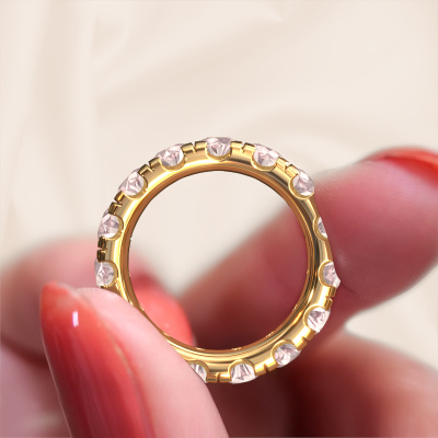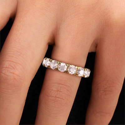 This is our Jackie 4.2 ring. This specific type is called an eternity ring and it is set with a continuous line of identically cut gemstones. The ring is made in 14 Carat gold and is set with small morganite champagne, 4.2 mm. This gold Eternity ring is a perfectly beautiful and meaningful way to give your proposal that special touch. The magnificent evenly shaped morganite champagne are pave set around the ring. The identical morganite champagne are carefully selected to give the ring a maximum effect. Do keep in mind we use natural resources so small differences between stones are common. The special effect is enhanced due to precise positioning of the morganite champagne. This requires the utmost precision and a skilful hand but for our skilled artisans this is what excites them. The result is a stackable ring with a row of morganite champagne which seem to have no beginning nor end. The perfect symbol of your love for her! Isn't she a beauty?After receiving your order, our goldsmiths will start the creative process of making your Jackie 4.2 ring. We don't keep stock. This is advantageous because these costs will not be passed on to you. Therefore, we can offer jewellery at exceptionally low prices.New jewellery designs are added to our online collection daily. Our team of passionate designers strive to create extraordinary and diverse designs. Have you seen a ring you like? Please feel free to contact us. Based on a good price/ quality ratio, we will make you an offer you can't refuse!To make it easier for you, we offer a 30 day return policy. Check our terms and conditions.