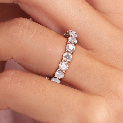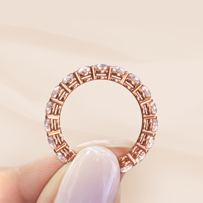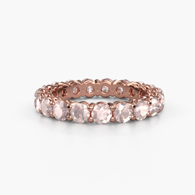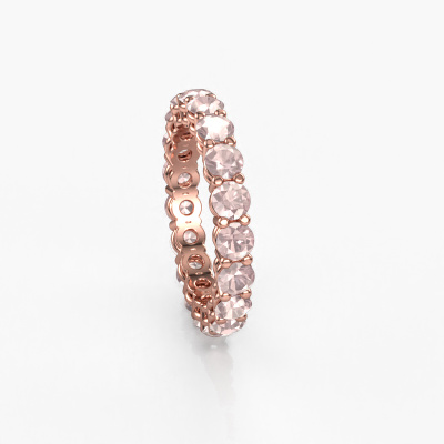 This is our Michelle full 3.4 ring. This specific type is called an eternity ring and it is set with a continuous line of identically cut gemstones. The ring is made in 14 Carat rose gold and is set with small morganite champagne, 3.4 mm. This rose gold Eternity ring is a perfectly beautiful and meaningful way to give your proposal that special touch. The magnificent evenly shaped morganite champagne are pave set around the ring. The identical morganite champagne are carefully selected to give the ring a maximum effect. Do keep in mind we use natural resources so small differences between stones are common. The special effect is enhanced due to precise positioning of the morganite champagne. This requires the utmost precision and a skilful hand but for our skilled artisans this is what excites them. The result is a stackable ring with a row of morganite champagne which seem to have no beginning nor end. The perfect symbol of your love for her! Isn't she a beauty?