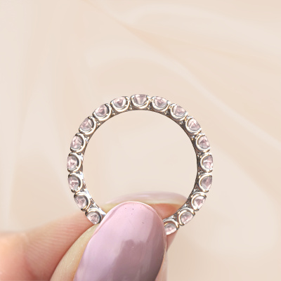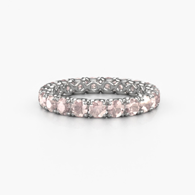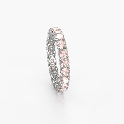 This is our Estee 2.9 ring. This specific type is called an eternity ring and it is set with a continuous line of identically cut gemstones. The ring is made in 14 Carat white gold and is set with small morganite champagne, 2.9 mm. This white gold Eternity ring is a perfectly beautiful and meaningful way to give your proposal that special touch. The magnificent evenly shaped morganite champagne are pave set around the ring. The identical morganite champagne are carefully selected to give the ring a maximum effect. Do keep in mind we use natural resources so small differences between stones are common. The special effect is enhanced due to precise positioning of the morganite champagne. This requires the utmost precision and a skilful hand but for our skilled artisans this is what excites them. The result is a stackable ring with a row of morganite champagne which seem to have no beginning nor end. The perfect symbol of your love for her! Isn't she a beauty?