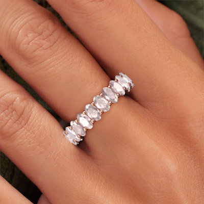 This Heddy OVL 3x5 stackable ring in 14 Carat rose gold is set with morganite champagne. This rose gold stacked Heddy OVL 3x5 ring is the perfect addition to your ring collection! As the name suggests, it is a ring which can be combined on one finger with another ring. It gives you the opportunity to create your own style. A stacked ring usually represents a certain memory of someone special or a memorable moment. It is common to combine a stacked ring, representing an anniversary, with a wedding ring. But this eternity ring, combined with your other rings, also makes a classy fashion item.