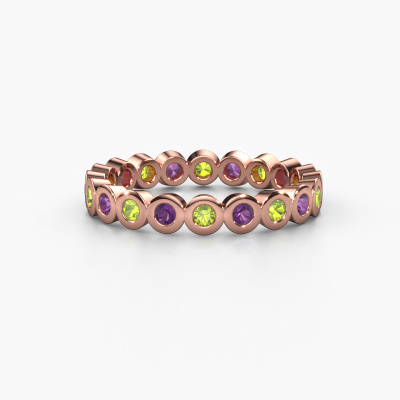 This is our Edwina 1 ring. This specific type is called an eternity ring and it is set with a continuous line of identically cut gemstones. The ring is made in 14 Carat rose gold and is set with small peridot, 2 mm. This rose gold Eternity ring is a perfectly beautiful and meaningful way to give your proposal that special touch. The magnificent evenly shaped peridot are pave set around the ring. The identical peridot are carefully selected to give the ring a maximum effect. Do keep in mind we use natural resources so small differences between stones are common. The special effect is enhanced due to precise positioning of the peridot. This requires the utmost precision and a skilful hand but for our skilled artisans this is what excites them. The result is a stackable ring with a row of peridot which seem to have no beginning nor end. The perfect symbol of your love for her! Isn't she a beauty?By using our modern techniques, we can design and customize the finest quality jewels with the utmost care for you. Our rings are always priced 30 percent lower than other jewellers. We make rings to order, so we don't have to maintain a large stock. If you have a certain budget, we are more than happy to advice you accordingly.New jewellery designs are added to our online collection daily. Our team of passionate designers strive to create extraordinary and diverse designs. Have you seen a ring you like? Please feel free to contact us. Based on a good price/ quality ratio, we will make you an offer you can't refuse!To make it easier for you, we offer a 30 day return policy. Check our terms and conditions.