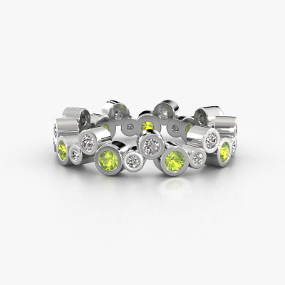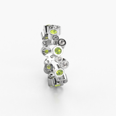 This is our Tessa ring. This specific type is called an eternity ring and it is set with a continuous line of identically cut gemstones. The ring is made in 14 Carat white gold and is set with small peridot, 2.5 mm. This white gold Eternity ring is a perfectly beautiful and meaningful way to give your proposal that special touch. The magnificent evenly shaped peridot are pave set around the ring. The identical peridot are carefully selected to give the ring a maximum effect. Do keep in mind we use natural resources so small differences between stones are common. The special effect is enhanced due to precise positioning of the peridot. This requires the utmost precision and a skilful hand but for our skilled artisans this is what excites them. The result is a ring with a row of peridot which seem to have no beginning nor end. The perfect symbol of your love for her! Isn't she a beauty?By using our modern techniques, we can design and customize the finest quality jewels with the utmost care for you. Our rings are always priced 30 percent lower than other jewellers. We make rings to order, so we don't have to maintain a large stock. If you have a certain budget, we are more than happy to advice you accordingly.Our talented designers add new designs to our online collection daily. Together they create a diverse collection of the finest jewellery. If you prefer to make a ring according your own design, please feel free to request a quote. We will make you an amazing offer, based on quality and price.To make it easier for you, we offer a 30 day return policy. Check our terms and conditions.