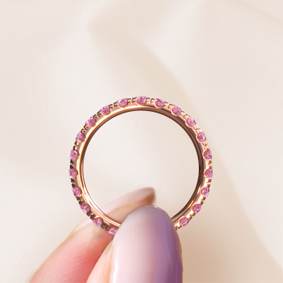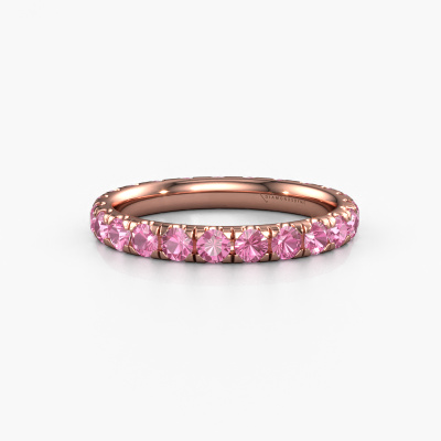 This is our Jackie 2.5 ring. This specific type is called an eternity ring and it is set with a continuous line of identically cut gemstones. The ring is made in 14 Carat rose gold and is set with small pink sapphire, 2.5 mm. This rose gold Eternity ring is a perfectly beautiful and meaningful way to give your proposal that special touch. The magnificent evenly shaped pink sapphire are pave set around the ring. The identical pink sapphire are carefully selected to give the ring a maximum effect. Do keep in mind we use natural resources so small differences between stones are common. The special effect is enhanced due to precise positioning of the pink sapphire. This requires the utmost precision and a skilful hand but for our skilled artisans this is what excites them. The result is a ring with a row of pink sapphire which seem to have no beginning nor end. The perfect symbol of your love for her! Isn't she a beauty?After receiving your order, our goldsmiths will start the creative process of making your Jackie 2.5 ring. We don't keep stock. This is advantageous because these costs will not be passed on to you. Therefore, we can offer jewellery at exceptionally low prices.New jewellery designs are added to our online collection daily. Our team of passionate designers strive to create extraordinary and diverse designs. Have you seen a ring you like? Please feel free to contact us. Based on a good price/ quality ratio, we will make you an offer you can't refuse!To make it easier for you, we offer a 30 day return policy. Check our terms and conditions.