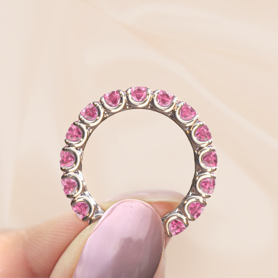 This Estee 4.0 ring in 14 Carat white gold is set with pink sapphire. This white gold stacked Estee 4.0 ring is the perfect addition to your ring collection! As the name suggests, it is a ring which can be combined on one finger with another ring. It gives you the opportunity to create your own style. A stacked ring usually represents a certain memory of someone special or a memorable moment. It is common to combine a stacked ring, representing an anniversary, with a wedding ring. But this eternity ring, combined with your other rings, also makes a classy fashion item. As soon as you finished designing your Estee 4.0 ring with our online tool, our goldsmiths will start their creative process of making your ring. This will be done with passion and care, according ancient crafting. On top of that, our jewels are made of eco-friendly materials. Simply customize online with our online tool, if you want any changes made. If you want specific changes made to your Estee 4.0 ring, that are unavailable in our online tool, please feel free to contact our expert designers.By using our modern techniques, we can design and customize the finest quality jewels with the utmost care for you. Our rings are always priced 30 percent lower than other jewellers. We make rings to order, so we don't have to maintain a large stock. If you have a certain budget, we are more than happy to advice you accordingly.To make it easier for you, we offer a 30 day return policy. Check our terms and conditions.