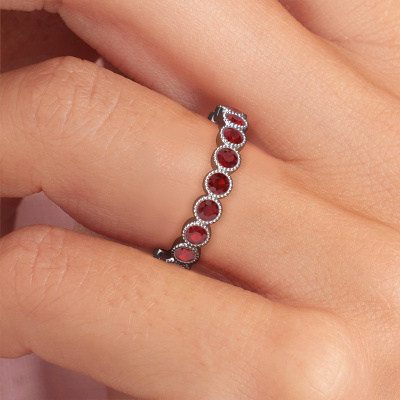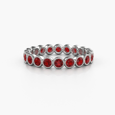 This is our Mariam 0.05 ring. This specific type is called an eternity ring and it is set with a continuous line of identically cut gemstones. The ring is made in platinum and is set with small ruby, 2.4 mm. The amazing ruby are identical in size and are set in the ring band. Our ruby are selected with great care so they are identical, which gives the best result. In order to get the best result, our artisans position all ruby by hand with the utmost care. Our Goldsmiths have one ambition, which is creating the perfect ring. That is why we love what we do. In the end you get a stunning modern platinum ring with a row of ruby which seem to have no beginning nor end. The perfect symbol of your undying love for her! How special is that!By using a combination of the latest modern techniques, combined with ancient crafting, we can make all our rings in our own studio. Each jewel is made to order. This is advantageous because we can offer you a price you won't find anywhere else.