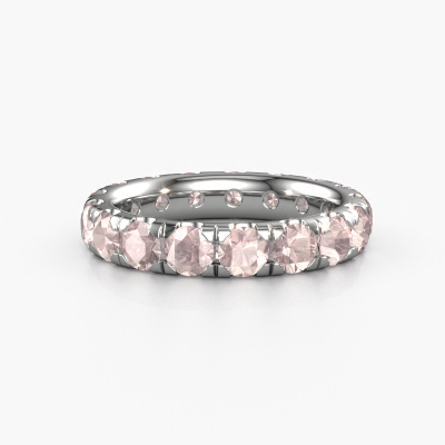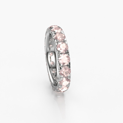 This is our Jackie 3.7 ring. This specific type is called an eternity ring and it is set with a continuous line of identically cut gemstones. The ring is made in platinum and is set with small morganite champagne, 3.7 mm. The amazing morganite champagne are identical in size and are set in the ring band. Our morganite champagne are selected with great care so they are identical, which gives the best result. In order to get the best result, our artisans position all morganite champagne by hand with the utmost care. Our Goldsmiths have one ambition, which is creating the perfect ring. That is why we love what we do. In the end you get a stunning exclusive platinum stackable ring with a row of morganite champagne which seem to have no beginning nor end. The perfect symbol of your undying love for her! How special is that!