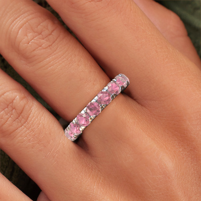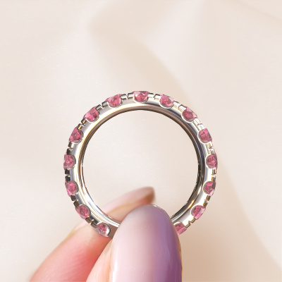 This is our Jackie 3.7 ring. This specific type is called an eternity ring and it is set with a continuous line of identically cut gemstones. The ring is made in platinum and is set with small tourmaline pink, 3.7 mm. The amazing tourmaline pink are identical in size and are set in the ring band. Our tourmaline pink are selected with great care so they are identical, which gives the best result. In order to get the best result, our artisans position all tourmaline pink by hand with the utmost care. Our Goldsmiths have one ambition, which is creating the perfect ring. That is why we love what we do. In the end you get a stunning modern platinum stackable ring with a row of tourmaline pink which seem to have no beginning nor end. The perfect symbol of your undying love for her! How special is that!By using our modern techniques, we can design and customize the finest quality jewels with the utmost care for you. Our rings are always priced 30 percent lower than other jewellers. We make rings to order, so we don't have to maintain a large stock. If you have a certain budget, we are more than happy to advice you accordingly.New jewellery designs are added to our online collection daily. Our team of passionate designers strive to create extraordinary and diverse designs. Have you seen a ring you like? Please feel free to contact us. Based on a good price/ quality ratio, we will make you an offer you can't refuse!To make it easier for you, we offer a 30 day return policy. Check our terms and conditions.