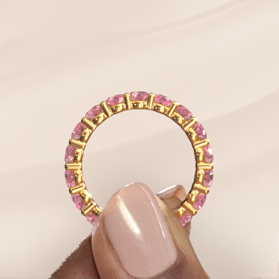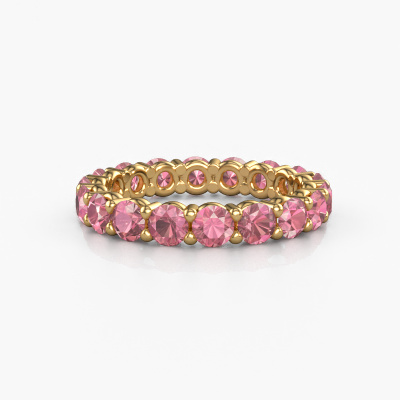 This is our Heddy rnd 3.4 ring. This specific type is called an eternity ring and it is set with a continuous line of identically cut gemstones. The ring is made in 14 Carat gold and is set with small tourmaline pink, 3.4 mm. The amazing tourmaline pink are identical in size and are set in the ring band. Our tourmaline pink are selected with great care so they are identical, which gives the best result. In order to get the best result, our artisans position all tourmaline pink by hand with the utmost care. Our Goldsmiths have one ambition, which is creating the perfect ring. That is why we love what we do. In the end you get a stunning modern gold ring with a row of tourmaline pink which seem to have no beginning nor end. The perfect symbol of your undying love for her! How special is that!After receiving your order, our goldsmiths will passionately start the creative process of making your ring in our own studio. Because we don't have a big stockpile, these costs will not be passed on to you. Our pricing is proof of that! We offer top quality jewels at lowest price, guaranteed.Our talented designers add new designs to our online collection daily. Together they create a diverse collection of the finest jewellery. If you prefer to make a ring according your own design, please feel free to request a quote. We will make you an amazing offer, based on quality and price.To make it easier for you, we offer a 30 day return policy. Check our terms and conditions.