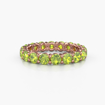 This is our Heddy rnd 3.4 ring. This specific type is called an eternity ring and it is set with a continuous line of identically cut gemstones. The ring is made in 14 Carat rose gold and is set with small peridot, 3.4 mm. The amazing peridot are identical in size and are set in the ring band. Our peridot are selected with great care so they are identical, which gives the best result. In order to get the best result, our artisans position all peridot by hand with the utmost care. Our Goldsmiths have one ambition, which is creating the perfect ring. That is why we love what we do. In the end you get a stunning modern rose gold ring with a row of peridot which seem to have no beginning nor end. The perfect symbol of your undying love for her! How special is that!After receiving your order, our goldsmiths will passionately start the creative process of making your ring in our own studio. Because we don't have a big stockpile, these costs will not be passed on to you. Our pricing is proof of that! We offer top quality jewels at lowest price, guaranteed.Our talented designers add new designs to our online collection daily. Together they create a diverse collection of the finest jewellery. If you prefer to make a ring according your own design, please feel free to request a quote. We will make you an amazing offer, based on quality and price.To make it easier for you, we offer a 30 day return policy. Check our terms and conditions.