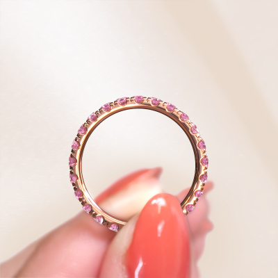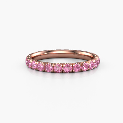 This is our Jackie 2.3 ring. This specific type is called an eternity ring and it is set with a continuous line of identically cut gemstones. The ring is made in 14 Carat rose gold and is set with small pink sapphire, 2.3 mm. The amazing pink sapphire are identical in size and are set in the ring band. Our pink sapphire are selected with great care so they are identical, which gives the best result. In order to get the best result, our artisans position all pink sapphire by hand with the utmost care. Our Goldsmiths have one ambition, which is creating the perfect ring. That is why we love what we do. In the end you get a stunning modern rose gold ring with a row of pink sapphire which seem to have no beginning nor end. The perfect symbol of your undying love for her! How special is that!Are you on a budget? Please feel free to contact us, so we can go discuss your options. We offer our rings at guaranteed best price, because we make them to order. You won't find such a price anywhere else!Our team of talented, passionate designers add new ring designs to our online collection daily. Our objective in doing so, is to be able to offer you a wide variety of jewels. Please feel free to request a quote if you have specific wishes for your ring. We guarantee to make you an offer you can't refuse.To make it easier for you, we offer a 30 day return policy. Check our terms and conditions.