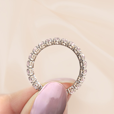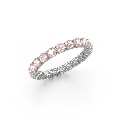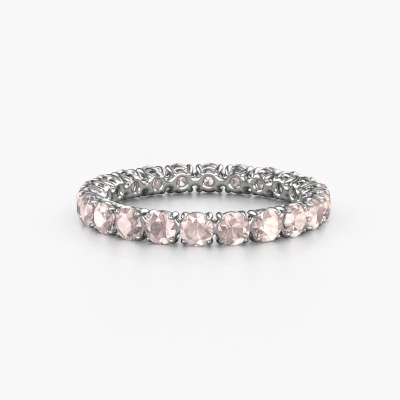 This is our Vivienne 2.7 ring. This specific type is called an eternity ring and it is set with a continuous line of identically cut gemstones. The ring is made in 14 Carat white gold and is set with small morganite champagne, 2.7 mm. The amazing morganite champagne are identical in size and are set in the ring band. Our morganite champagne are selected with great care so they are identical, which gives the best result. In order to get the best result, our artisans position all morganite champagne by hand with the utmost care. Our Goldsmiths have one ambition, which is creating the perfect ring. That is why we love what we do. In the end you get a stunning classic white gold ring with a row of morganite champagne which seem to have no beginning nor end. The perfect symbol of your undying love for her! How special is that!