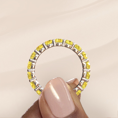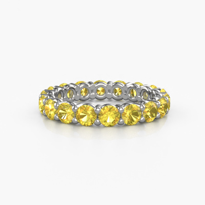 This is our Heddy rnd 3.4 ring. This specific type is called an eternity ring and it is set with a continuous line of identically cut gemstones. The ring is made in 14 Carat white gold and is set with small yellow sapphire, 3.4 mm. The amazing yellow sapphire are identical in size and are set in the ring band. Our yellow sapphire are selected with great care so they are identical, which gives the best result. In order to get the best result, our artisans position all yellow sapphire by hand with the utmost care. Our Goldsmiths have one ambition, which is creating the perfect ring. That is why we love what we do. In the end you get a stunning modern white gold ring with a row of yellow sapphire which seem to have no beginning nor end. The perfect symbol of your undying love for her! How special is that!After receiving your order, our goldsmiths will passionately start the creative process of making your ring in our own studio. Because we don't have a big stockpile, these costs will not be passed on to you. Our pricing is proof of that! We offer top quality jewels at lowest price, guaranteed.Our talented designers add new designs to our online collection daily. Together they create a diverse collection of the finest jewellery. If you prefer to make a ring according your own design, please feel free to request a quote. We will make you an amazing offer, based on quality and price.To make it easier for you, we offer a 30 day return policy. Check our terms and conditions.