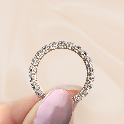 This is our Vivienne 2.7 ring. This specific type is called an eternity ring and it is set with a continuous line of identically cut gemstones. The ring is made in 14 Carat white gold and is set with small cz-stones, 2.7 mm. The amazing cz-stones are identical in size and are set in the ring band. Our cz-stones are selected with great care so they are identical, which gives the best result. In order to get the best result, our artisans position all cz-stones by hand with the utmost care. Our Goldsmiths have one ambition, which is creating the perfect ring. That is why we love what we do. In the end you get a stunning classic white gold ring with a row of cz-stones which seem to have no beginning nor end. The perfect symbol of your undying love for her! How special is that!After receiving your order, our goldsmiths will passionately start the creative process of making your ring in our own studio. Because we don't have a big stockpile, these costs will not be passed on to you. Our pricing is proof of that! We offer top quality jewels at lowest price, guaranteed.Our talented designers add new designs to our online collection daily. Together they create a diverse collection of the finest jewellery. If you prefer to make a ring according your own design, please feel free to request a quote. We will make you an amazing offer, based on quality and price.To make it easier for you, we offer a 30 day return policy. Check our terms and conditions.