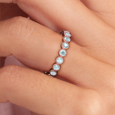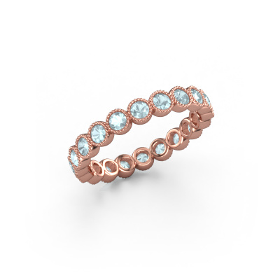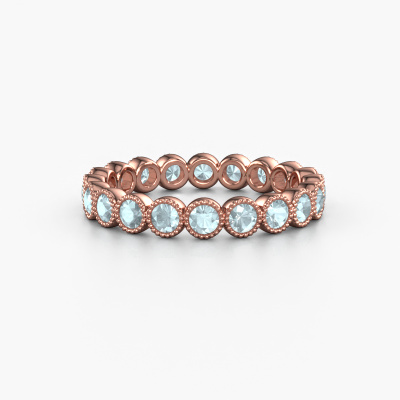 This is our Mariam 0.05 ring. This specific type is called an eternity ring and it is set with a continuous line of identically cut gemstones. The ring is made in 14 Carat rose gold and is set with small aquamarine, 2.4 mm. The amazing aquamarine are identical in size and are set in the ring band. Our aquamarine are selected with great care so they are identical, which gives the best result. In order to get the best result, our artisans position all aquamarine by hand with the utmost care. Our Goldsmiths have one ambition, which is creating the perfect ring. That is why we love what we do. In the end you get a stunning modern rose gold ring with a row of aquamarine which seem to have no beginning nor end. The perfect symbol of your undying love for her! How special is that!By using a combination of the latest modern techniques, combined with ancient crafting, we can make all our rings in our own studio. Each jewel is made to order. This is advantageous because we can offer you a price you won't find anywhere else.