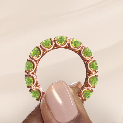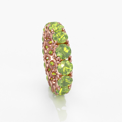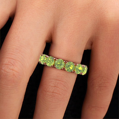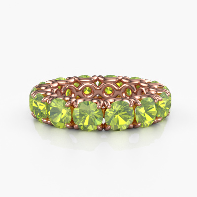 This is our Estee 5.0 ring. This specific type is called an eternity ring and it is set with a continuous line of identically cut gemstones. The ring is made in 14 Carat rose gold and is set with small peridot, 5 mm. The amazing peridot are identical in size and are set in the ring band. Our peridot are selected with great care so they are identical, which gives the best result. In order to get the best result, our artisans position all peridot by hand with the utmost care. Our Goldsmiths have one ambition, which is creating the perfect ring. That is why we love what we do. In the end you get a stunning exclusive rose gold ring with a row of peridot which seem to have no beginning nor end. The perfect symbol of your undying love for her! How special is that!Are you on a budget? Please feel free to contact us, so we can go discuss your options. We offer our rings at guaranteed best price, because we make them to order. You won't find such a price anywhere else!Our talented designers add new designs to our online collection daily. Together they create a diverse collection of the finest jewellery. If you prefer to make a ring according your own design, please feel free to request a quote. We will make you an amazing offer, based on quality and price.To make it easier for you, we offer a 30 day return policy. Check our terms and conditions.