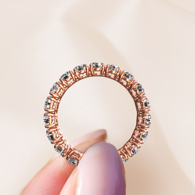 This is our Vivienne 3.4 ring. This specific type is called an eternity ring and it is set with a continuous line of identically cut gemstones. The ring is made in 14 Carat rose gold and is set with small diamonds, 2.700 crt. The amazing diamonds are identical in size and are set in the ring band. Our diamonds are selected with great care so they are identical, which gives the best result. In order to get the best result, our artisans position all diamonds by hand with the utmost care. Our Goldsmiths have one ambition, which is creating the perfect ring. That is why we love what we do. In the end you get a stunning classic rose gold stackable ring with a row of diamonds which seem to have no beginning nor end. The perfect symbol of your undying love for her! How special is that!Are you on a budget? Please feel free to contact us, so we can go discuss your options. We offer our rings at guaranteed best price, because we make them to order. You won't find such a price anywhere else!Our team of talented, passionate designers add new ring designs to our online collection daily. Our objective in doing so, is to be able to offer you a wide variety of jewels. Please feel free to request a quote if you have specific wishes for your ring. We guarantee to make you an offer you can't refuse.To make it easier for you, we offer a 30 day return policy. Check our terms and conditions.