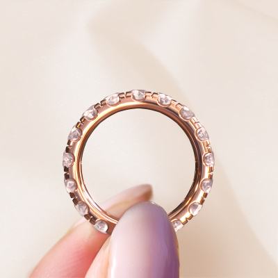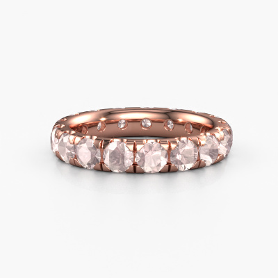 This is our Jackie 3.7 ring. This specific type is called an eternity ring and it is set with a continuous line of identically cut gemstones. The ring is made in 14 Carat rose gold and is set with small morganite champagne, 3.7 mm. The amazing morganite champagne are identical in size and are set in the ring band. Our morganite champagne are selected with great care so they are identical, which gives the best result. In order to get the best result, our artisans position all morganite champagne by hand with the utmost care. Our Goldsmiths have one ambition, which is creating the perfect ring. That is why we love what we do. In the end you get a stunning exclusive rose gold stackable ring with a row of morganite champagne which seem to have no beginning nor end. The perfect symbol of your undying love for her! How special is that!