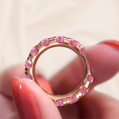 This is our Jackie 4.7 ring. This specific type is called an eternity ring and it is set with a continuous line of identically cut gemstones. The ring is made in 14 Carat rose gold and is set with small pink sapphire, 4.7 mm. The amazing pink sapphire are identical in size and are set in the ring band. Our pink sapphire are selected with great care so they are identical, which gives the best result. In order to get the best result, our artisans position all pink sapphire by hand with the utmost care. Our Goldsmiths have one ambition, which is creating the perfect ring. That is why we love what we do. In the end you get a stunning exclusive rose gold stackable ring with a row of pink sapphire which seem to have no beginning nor end. The perfect symbol of your undying love for her! How special is that!Because we design and deliver our own rings, we can offer you a ring at a price you won't find anywhere else. A ring is made to order, which helps prevent excess supplies, so we can make you a great price offer. We understand it feels risky, buying your ring online, but we will gladly assist in the designing process, taking your budget into consideration.Our team of talented, passionate designers add new ring designs to our online collection daily. Our objective in doing so, is to be able to offer you a wide variety of jewels. Please feel free to request a quote if you have specific wishes for your ring. We guarantee to make you an offer you can't refuse.To make it easier for you, we offer a 30 day return policy. Check our terms and conditions.