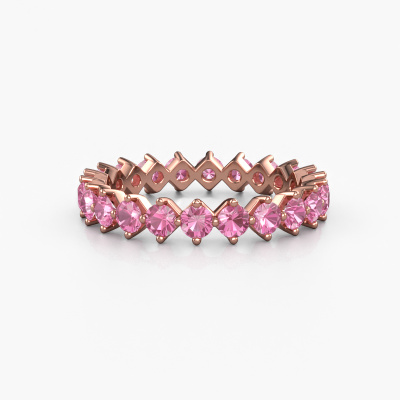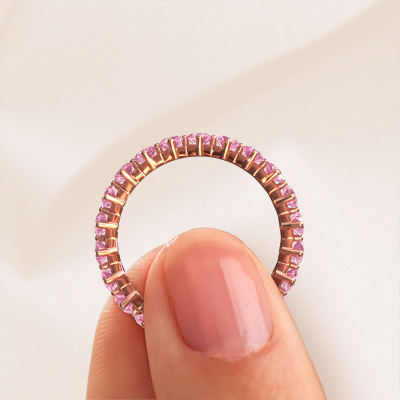 This is our Janie 2.7mm ring. This specific type is called an eternity ring and it is set with a continuous line of identically cut gemstones. The ring is made in 14 Carat rose gold and is set with small pink sapphire, 2.7 mm. The amazing pink sapphire are identical in size and are set in the ring band. Our pink sapphire are selected with great care so they are identical, which gives the best result. In order to get the best result, our artisans position all pink sapphire by hand with the utmost care. Our Goldsmiths have one ambition, which is creating the perfect ring. That is why we love what we do. In the end you get a stunning trendy rose gold stackable ring with a row of pink sapphire which seem to have no beginning nor end. The perfect symbol of your undying love for her! How special is that!By using a combination of the latest modern techniques, combined with ancient crafting, we can make all our rings in our own studio. Each jewel is made to order. This is advantageous because we can offer you a price you won't find anywhere else.