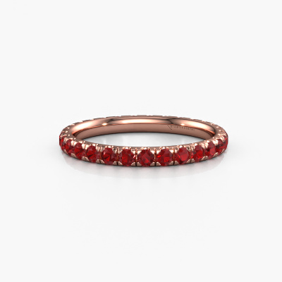This is our Jackie 2.0 ring. This specific type is called an eternity ring and it is set with a continuous line of identically cut gemstones. The ring is made in 14 Carat rose gold and is set with small ruby, 2 mm. The amazing ruby are identical in size and are set in the ring band. Our ruby are selected with great care so they are identical, which gives the best result. In order to get the best result, our artisans position all ruby by hand with the utmost care. Our Goldsmiths have one ambition, which is creating the perfect ring. That is why we love what we do. In the end you get a stunning modern rose gold stackable ring with a row of ruby which seem to have no beginning nor end. The perfect symbol of your undying love for her! How special is that!By using our modern techniques, we can design and customize the finest quality jewels with the utmost care for you. Our rings are always priced 30 percent lower than other jewellers. We make rings to order, so we don't have to maintain a large stock. If you have a certain budget, we are more than happy to advice you accordingly.New jewellery designs are added to our online collection daily. Our team of passionate designers strive to create extraordinary and diverse designs. Have you seen a ring you like? Please feel free to contact us. Based on a good price/ quality ratio, we will make you an offer you can't refuse!To make it easier for you, we offer a 30 day return policy. Check our terms and conditions.