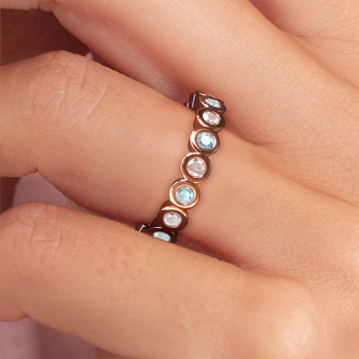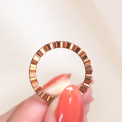 This is our Edwina 2 ring. This specific type is called an eternity ring and it is set with a continuous line of identically cut gemstones. The ring is made in 14 Carat rose gold and is set with small morganite champagne, 2.5 mm. The amazing morganite champagne are identical in size and are set in the ring band. Our morganite champagne are selected with great care so they are identical, which gives the best result. In order to get the best result, our artisans position all morganite champagne by hand with the utmost care. Our Goldsmiths have one ambition, which is creating the perfect ring. That is why we love what we do. In the end you get a stunning trendy rose gold stackable ring with a row of morganite champagne which seem to have no beginning nor end. The perfect symbol of your undying love for her! How special is that!