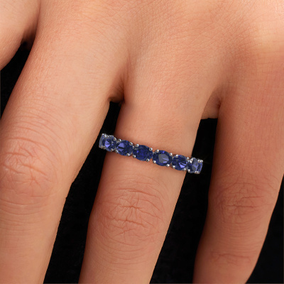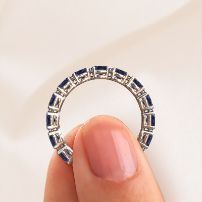 This is our Vivienne OVL 4x3 ring. This specific type is called an eternity ring and it is set with a continuous line of identically cut gemstones. The ring is made in 14 Carat white gold and is set with small sapphire, 4x3 mm. This white gold Eternity ring is a perfectly beautiful and meaningful way to give your proposal that special touch. The magnificent evenly shaped sapphire are pave set around the ring. The identical sapphire are carefully selected to give the ring a maximum effect. Do keep in mind we use natural resources so small differences between stones are common. The special effect is enhanced due to precise positioning of the sapphire. This requires the utmost precision and a skilful hand but for our skilled artisans this is what excites them. The result is a ring with a row of sapphire which seem to have no beginning nor end. The perfect symbol of your love for her! Isn't she a beauty?Because we design and deliver our own rings, we can offer you a ring at a price you won't find anywhere else. A ring is made to order, which helps prevent excess supplies, so we can make you a great price offer. We understand it feels risky, buying your ring online, but we will gladly assist in the designing process, taking your budget into consideration.Our team of talented, passionate designers add new ring designs to our online collection daily. Our objective in doing so, is to be able to offer you a wide variety of jewels. Please feel free to request a quote if you have specific wishes for your ring. We guarantee to make you an offer you can't refuse.To make it easier for you, we offer a 30 day return policy. Check our terms and conditions.