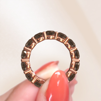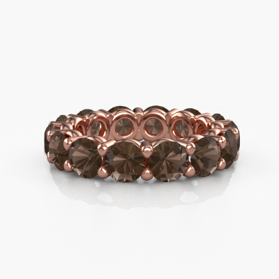 This is our Heddy rnd 4.7 ring. This specific type is called an eternity ring and it is set with a continuous line of identically cut gemstones. The ring is made in 14 Carat rose gold and is set with small smokey quartz, 4.7 mm. This rose gold Eternity ring is a perfectly beautiful and meaningful way to give your proposal that special touch. The magnificent evenly shaped smokey quartz are pave set around the ring. The identical smokey quartz are carefully selected to give the ring a maximum effect. Do keep in mind we use natural resources so small differences between stones are common. The special effect is enhanced due to precise positioning of the smokey quartz. This requires the utmost precision and a skilful hand but for our skilled artisans this is what excites them. The result is a ring with a row of smokey quartz which seem to have no beginning nor end. The perfect symbol of your love for her! Isn't she a beauty?Because we design and deliver our own rings, we can offer you a ring at a price you won't find anywhere else. A ring is made to order, which helps prevent excess supplies, so we can make you a great price offer. We understand it feels risky, buying your ring online, but we will gladly assist in the designing process, taking your budget into consideration.Our team of talented, passionate designers add new ring designs to our online collection daily. Our objective in doing so, is to be able to offer you a wide variety of jewels. Please feel free to request a quote if you have specific wishes for your ring. We guarantee to make you an offer you can't refuse.To make it easier for you, we offer a 30 day return policy. Check our terms and conditions.