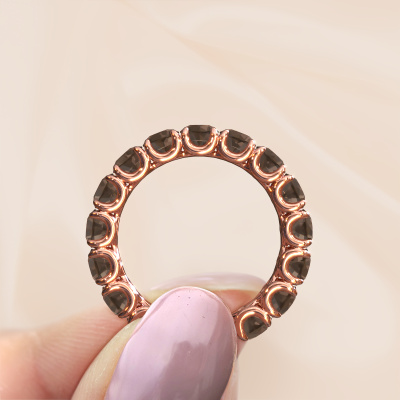 This Estee 4.0 ring in 14 Carat rose gold is set with smokey quartz. This rose gold stacked Estee 4.0 ring is the perfect addition to your ring collection! As the name suggests, it is a ring which can be combined on one finger with another ring. It gives you the opportunity to create your own style. A stacked ring usually represents a certain memory of someone special or a memorable moment. It is common to combine a stacked ring, representing an anniversary, with a wedding ring. But this eternity ring, combined with your other rings, also makes a classy fashion item. As soon as you finished designing your Estee 4.0 ring with our online tool, our goldsmiths will start their creative process of making your ring. This will be done with passion and care, according ancient crafting. On top of that, our jewels are made of eco-friendly materials. Simply customize online with our online tool, if you want any changes made. If you want specific changes made to your Estee 4.0 ring, that are unavailable in our online tool, please feel free to contact our expert designers.By using our modern techniques, we can design and customize the finest quality jewels with the utmost care for you. Our rings are always priced 30 percent lower than other jewellers. We make rings to order, so we don't have to maintain a large stock. If you have a certain budget, we are more than happy to advice you accordingly.To make it easier for you, we offer a 30 day return policy. Check our terms and conditions.