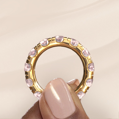 This is our Jackie 5.0 ring. This specific type is called an eternity ring and it is set with a continuous line of identically cut gemstones. The ring is made in 14 Carat gold and is set with small morganite champagne, 5 mm. The amazing morganite champagne are identical in size and are set in the ring band. Our morganite champagne are selected with great care so they are identical, which gives the best result. In order to get the best result, our artisans position all morganite champagne by hand with the utmost care. Our Goldsmiths have one ambition, which is creating the perfect ring. That is why we love what we do. In the end you get a stunning exclusive gold stackable ring with a row of morganite champagne which seem to have no beginning nor end. The perfect symbol of your undying love for her! How special is that!After receiving your order, our goldsmiths will passionately start the creative process of making your ring in our own studio. Because we don't have a big stockpile, these costs will not be passed on to you. Our pricing is proof of that! We offer top quality jewels at lowest price, guaranteed.Our talented designers add new designs to our online collection daily. Together they create a diverse collection of the finest jewellery. If you prefer to make a ring according your own design, please feel free to request a quote. We will make you an amazing offer, based on quality and price.To make it easier for you, we offer a 30 day return policy. Check our terms and conditions.