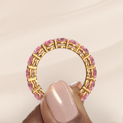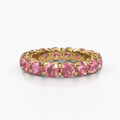 This is our Michelle full 4.0 ring. This specific type is called an eternity ring and it is set with a continuous line of identically cut gemstones. The ring is made in 14 Carat gold and is set with small tourmaline pink, 4 mm. The amazing tourmaline pink are identical in size and are set in the ring band. Our tourmaline pink are selected with great care so they are identical, which gives the best result. In order to get the best result, our artisans position all tourmaline pink by hand with the utmost care. Our Goldsmiths have one ambition, which is creating the perfect ring. That is why we love what we do. In the end you get a stunning modern gold stackable ring with a row of tourmaline pink which seem to have no beginning nor end. The perfect symbol of your undying love for her! How special is that!By using a combination of the latest modern techniques, combined with ancient crafting, we can make all our rings in our own studio. Each jewel is made to order. This is advantageous because we can offer you a price you won't find anywhere else.Our talented designers add new designs to our online collection daily. Together they create a diverse collection of the finest jewellery. If you prefer to make a ring according your own design, please feel free to request a quote. We will make you an amazing offer, based on quality and price.To make it easier for you, we offer a 30 day return policy. Check our terms and conditions.