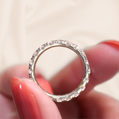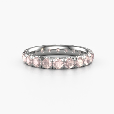 This is our Jackie 3.0 ring. This specific type is called an eternity ring and it is set with a continuous line of identically cut gemstones. The ring is made in platinum and is set with small morganite champagne, 3 mm. The amazing morganite champagne are identical in size and are set in the ring band. Our morganite champagne are selected with great care so they are identical, which gives the best result. In order to get the best result, our artisans position all morganite champagne by hand with the utmost care. Our Goldsmiths have one ambition, which is creating the perfect ring. That is why we love what we do. In the end you get a stunning exclusive platinum stackable ring with a row of morganite champagne which seem to have no beginning nor end. The perfect symbol of your undying love for her! How special is that!