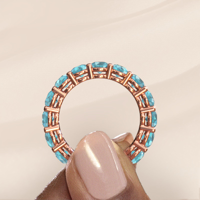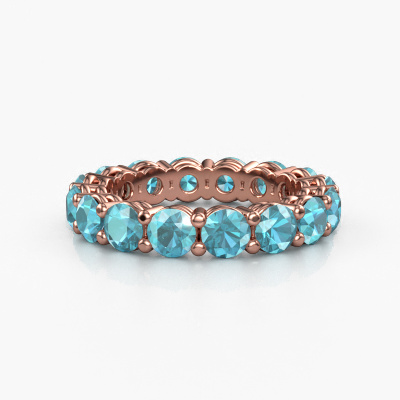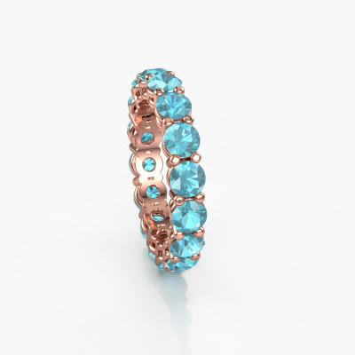 This is our Michelle full 4.0 ring. This specific type is called an eternity ring and it is set with a continuous line of identically cut gemstones. The ring is made in 14 Carat rose gold and is set with small blue topaz, 4 mm. The amazing blue topaz are identical in size and are set in the ring band. Our blue topaz are selected with great care so they are identical, which gives the best result. In order to get the best result, our artisans position all blue topaz by hand with the utmost care. Our Goldsmiths have one ambition, which is creating the perfect ring. That is why we love what we do. In the end you get a stunning modern rose gold stackable ring with a row of blue topaz which seem to have no beginning nor end. The perfect symbol of your undying love for her! How special is that!By using a combination of the latest modern techniques, combined with ancient crafting, we can make all our rings in our own studio. Each jewel is made to order. This is advantageous because we can offer you a price you won't find anywhere else.Our talented designers add new designs to our online collection daily. Together they create a diverse collection of the finest jewellery. If you prefer to make a ring according your own design, please feel free to request a quote. We will make you an amazing offer, based on quality and price.To make it easier for you, we offer a 30 day return policy. Check our terms and conditions.