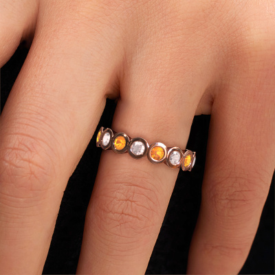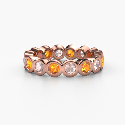 This is our Edwina 3 ring. This specific type is called an eternity ring and it is set with a continuous line of identically cut gemstones. The ring is made in 14 Carat rose gold and is set with small morganite champagne, 3 mm. The amazing morganite champagne are identical in size and are set in the ring band. Our morganite champagne are selected with great care so they are identical, which gives the best result. In order to get the best result, our artisans position all morganite champagne by hand with the utmost care. Our Goldsmiths have one ambition, which is creating the perfect ring. That is why we love what we do. In the end you get a stunning trendy rose gold stackable ring with a row of morganite champagne which seem to have no beginning nor end. The perfect symbol of your undying love for her! How special is that!