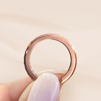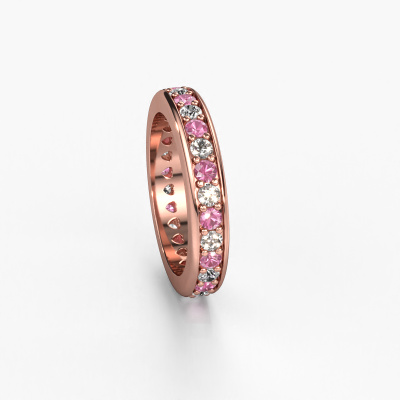 This is our Nienke ring. This specific type is called an eternity ring and it is set with a continuous line of identically cut gemstones. The ring is made in 14 Carat rose gold and is set with small pink sapphire, 2.2 mm. The amazing pink sapphire are identical in size and are set in the ring band. Our pink sapphire are selected with great care so they are identical, which gives the best result. In order to get the best result, our artisans position all pink sapphire by hand with the utmost care. Our Goldsmiths have one ambition, which is creating the perfect ring. That is why we love what we do. In the end you get a stunning modern rose gold stackable ring with a row of pink sapphire which seem to have no beginning nor end. The perfect symbol of your undying love for her! How special is that!After receiving your order, our goldsmiths will start the creative process of making your Nienke ring. We don't keep stock. This is advantageous because these costs will not be passed on to you. Therefore, we can offer jewellery at exceptionally low prices.Our team of talented, passionate designers add new ring designs to our online collection daily. Our objective in doing so, is to be able to offer you a wide variety of jewels. Please feel free to request a quote if you have specific wishes for your ring. We guarantee to make you an offer you can't refuse.To make it easier for you, we offer a 30 day return policy. Check our terms and conditions.