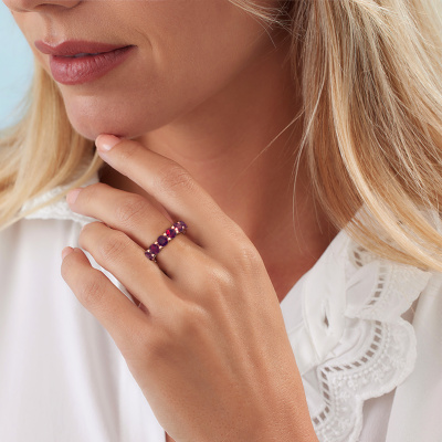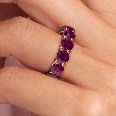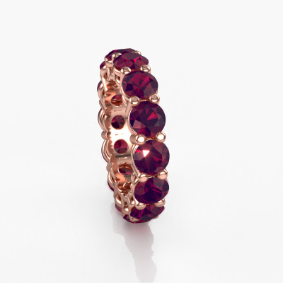 This is our Michelle full 5.0 ring. This specific type is called an eternity ring and it is set with a continuous line of identically cut gemstones. The ring is made in 14 Carat rose gold and is set with small rhodolite, 5 mm. The amazing rhodolite are identical in size and are set in the ring band. Our rhodolite are selected with great care so they are identical, which gives the best result. In order to get the best result, our artisans position all rhodolite by hand with the utmost care. Our Goldsmiths have one ambition, which is creating the perfect ring. That is why we love what we do. In the end you get a stunning exclusive rose gold stackable ring with a row of rhodolite which seem to have no beginning nor end. The perfect symbol of your undying love for her! How special is that!By using a combination of the latest modern techniques, combined with ancient crafting, we can make all our rings in our own studio. Each jewel is made to order. This is advantageous because we can offer you a price you won't find anywhere else.New jewellery designs are added to our online collection daily. Our team of passionate designers strive to create extraordinary and diverse designs. Have you seen a ring you like? Please feel free to contact us. Based on a good price/ quality ratio, we will make you an offer you can't refuse!To make it easier for you, we offer a 30 day return policy. Check our terms and conditions.